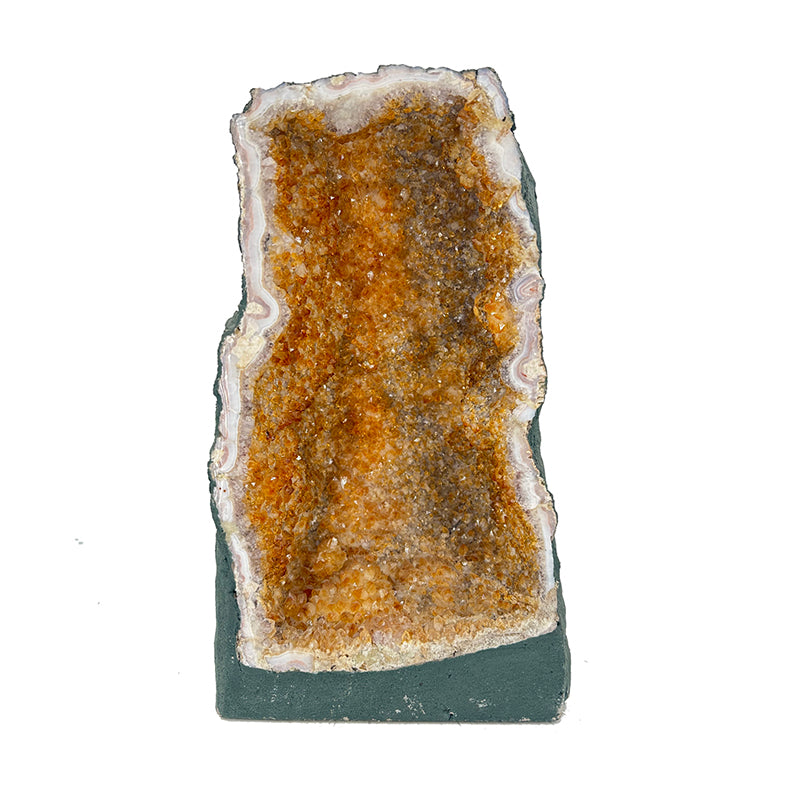 - Signification : La Géode de Citrine (Améthyste Chauffée) représente l'union harmonieuse entre la lumière solaire et la sagesse intérieure. Elle incarne le renouveau, l'optimisme et la force de transformation, guidant son porteur vers un avenir riche en énergie positive.